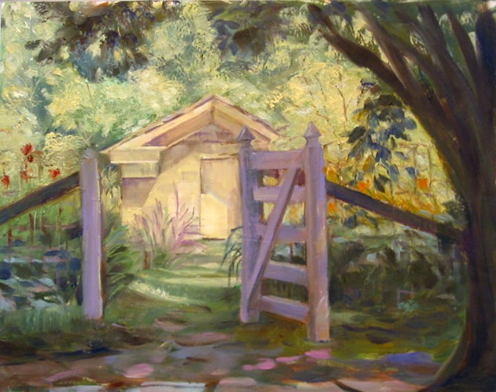 This painting was plein air started and inspired. But when I got back in my studio, I decided to reduce the size of the outbuilding. I needed to lengthen the path from the shaded gate area , where I sat, to the door. There was lots of sunshine and shade from huge trees at Fort Hunter that morning--garden gates and charming flower beds galore and plenty of quaint things and areas to paint.